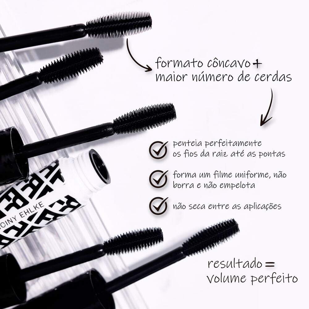 Nível máximo de volume sem borrar; Combinação perfeita entre volume, alongamento, curvatura e definição; Aderência perfeita aos cílios; Sem parabenos; Não testado em animais. Sem glúten; Sem fragrância; Cria um filme plástico que encorpa os cílios; O maior número de cerdas penteia perfeitamente os fios, promovendo volume sem grudar; Combinação de ativos que permitem cílios flexíveis e confortáveis.